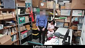 In the shop, the young teen suspect gets caught spying and submits to fucking, riding in cowgirl position at work
