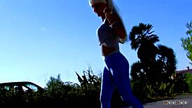 blonde cougar sucks deepthroat to drain full balls in public leggings