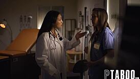 Doctor Vicki Chase ensures Nurse Sinn Sage keeps the secret with intense lesbian sex in the hospital